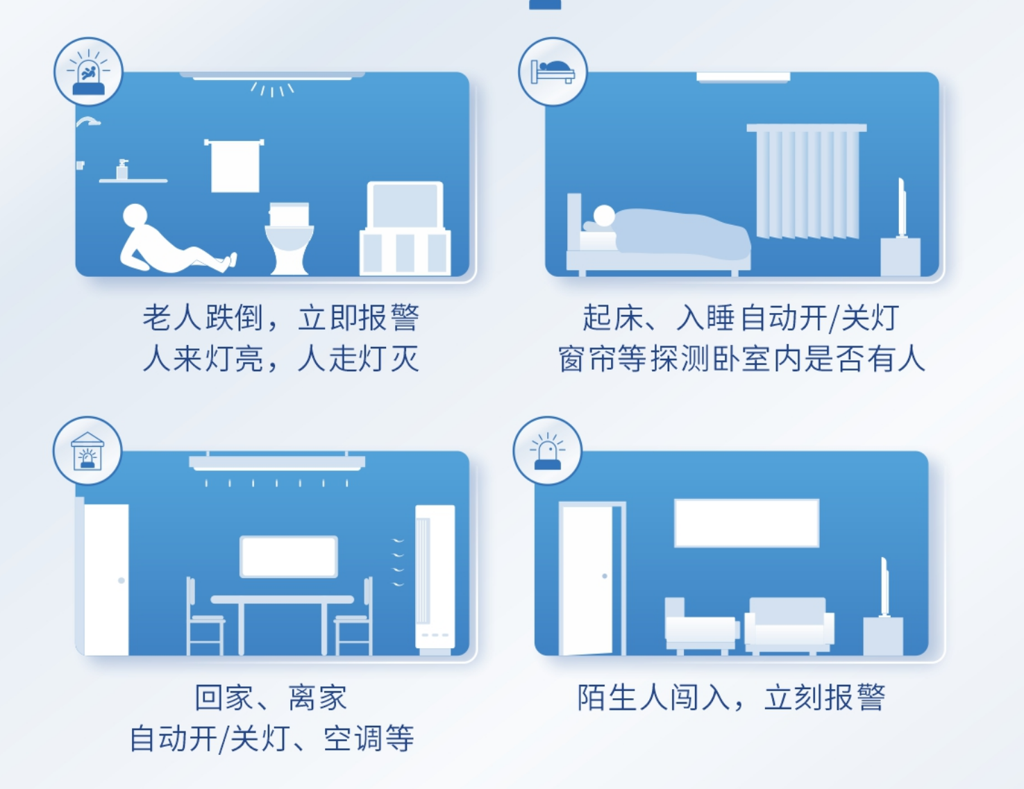 主要應用于智慧養老産品,通過(guò)反射的點雲狀态、多普勒等方式,毫米波雷達可以判斷老人處于站立或跌倒狀态。随著(zhe)毫米波雷達的精度持續提升,點雲成(chéng)像的效果就會(huì)逼近于攝象頭成(chéng)像,識别效果更佳。