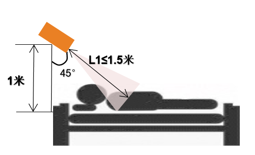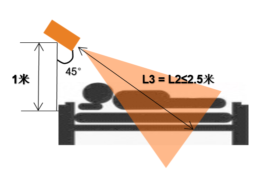 雷達傾斜安裝,傾斜角度爲45°,安裝在床頭上方,雷達安裝高度建議爲高于床面(miàn)1m;保證雷達主波束覆蓋探測區域;雷達前面(miàn)無明顯遮擋物及覆蓋物。受雷達安裝高度及雷達波束範圍影響,在該安裝模式下,人體存在檢測最大距離L3 ≈ 2.5米;睡眠檢測最大距離L2 ≈ 2.5米;人體呼吸頻率檢測最大距離L1 ≈ 1.5米。